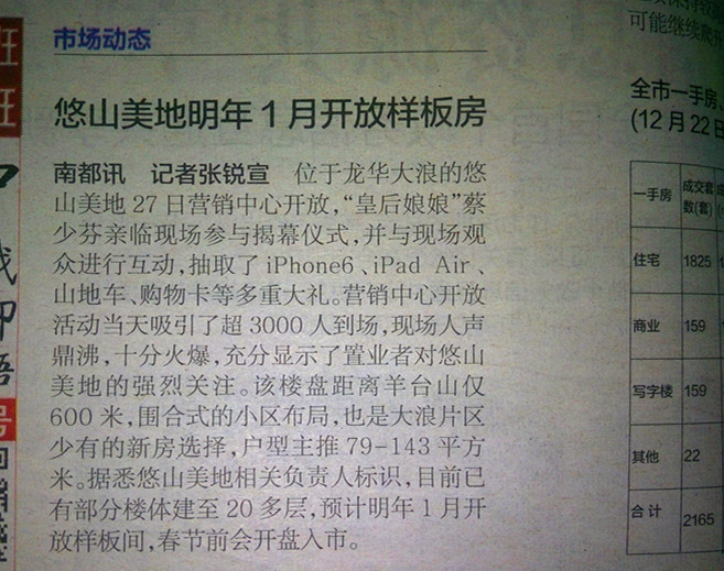 南都讯 记者张锐宣 位于龙华大浪的悠山美地27日营销中心开放,“皇后娘娘”蔡少芬亲临现场参与揭幕仪式,并与现场观众进行互动,抽取了iPhone6、iPadA ir、山地车、购物卡等多重大礼。营销中心开放活动当天吸引了超3000人到场,现场人声鼎沸,十分火爆,充分显示了置业者对悠山美地的强烈关注。该楼盘距离羊台山仅600米,围合式的小区布局,也是大浪片区少有的新房选择,户型主推79-143平方米。据悉悠山美地相关负责人标识,目前已有部分楼体建至20多层,预计明年1月开放样板间,春节前会开盘入市。(摘自:《南方都市报》)
